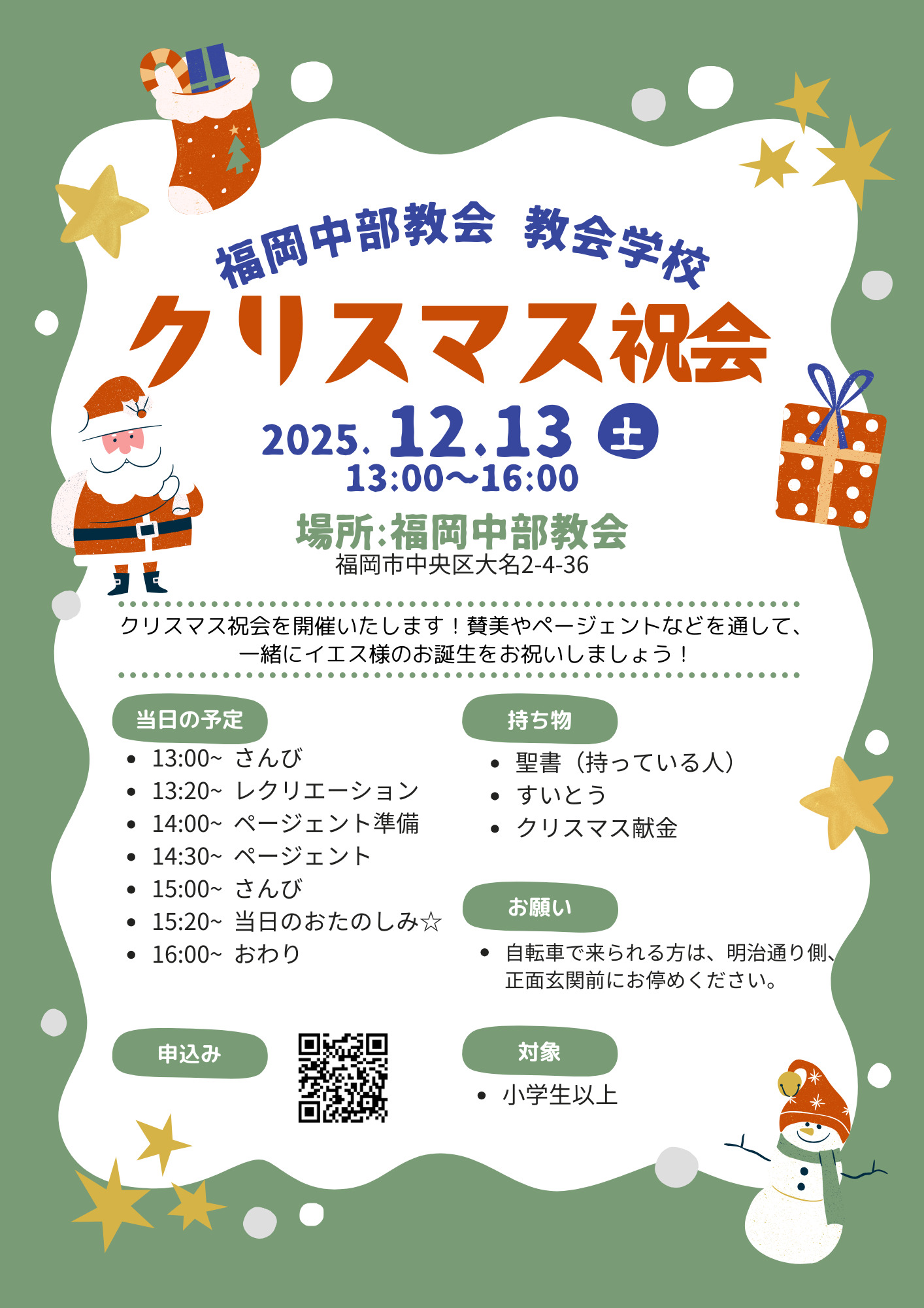福岡中部教会の教会学校でクリスマス祝会が開かれます。今年もみんなで、賛美やページェントを通して、イエス様のお誕生をお祝いしましょう!